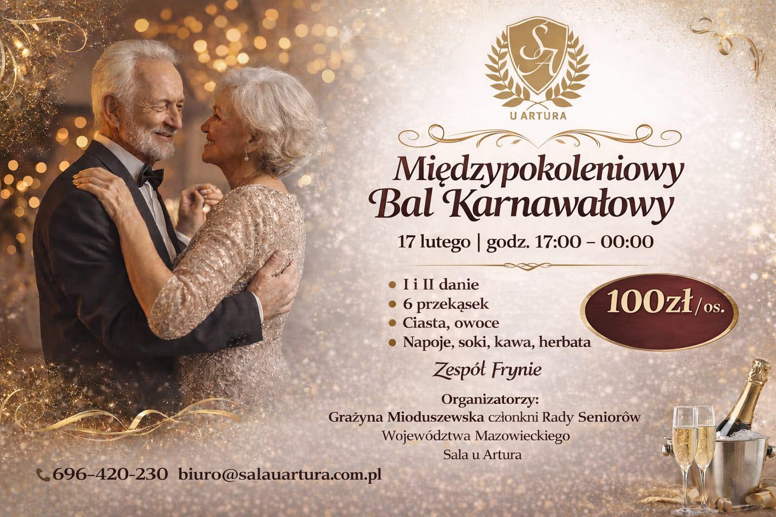 Koszt udziału wynosi 100 zł/os. i obejmuje pełne menu, napoje oraz oprawę muzyczną (Zespół Frynie).